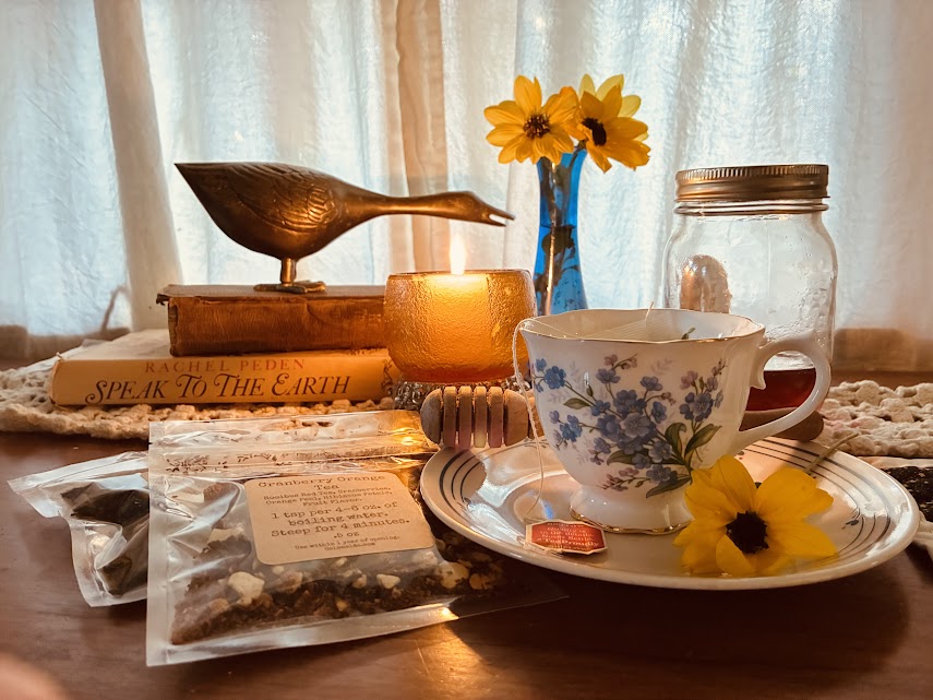 Until you’re still, you’ll never hear the thoughts that count, the ones that remind you of how the sun looked streaming into your bedroom window that morning; you forget to wonder how someone might be doing, the ones you haven’t heard from in a while. To sit with a tea, to fiddle with linens on the table, to sip carefully, is a chance for your soul to speak up. Sometimes mine says to me, “go smell that rose bush before the frost gets ahold of it.” A to-do list that includes “smell the rose bush” is a happy list, not all tasks are daunting. A side quest could unfold, you might find yourself cutting a backyard bouquet of zinnias for the neighbor, and then remembering someone’s birthday is just around the corner, you wind up immersed in one of those spiral church cookbooks reading cupcake recipes. Time for a refill.